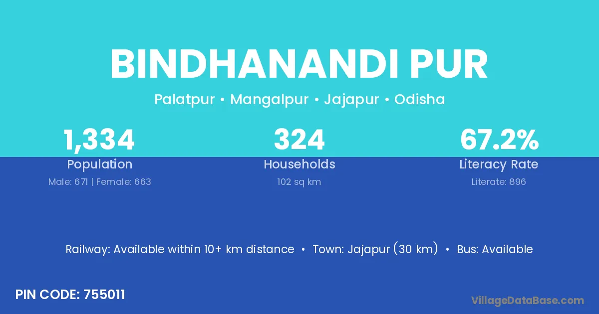 Jajapur (30 km) is the nearest town to Bindhanandi Pur village for major economic activities and is located approximately 30 km away.
