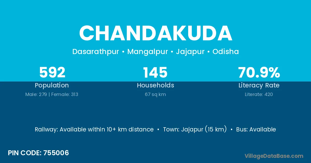 Jajapur (15 km) is the nearest town to Chandakuda village for major economic activities and is located approximately 15 km away.