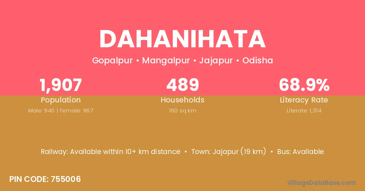 Jajapur (19 km) is the nearest town to Dahanihata village for major economic activities and is located approximately 19 km away.