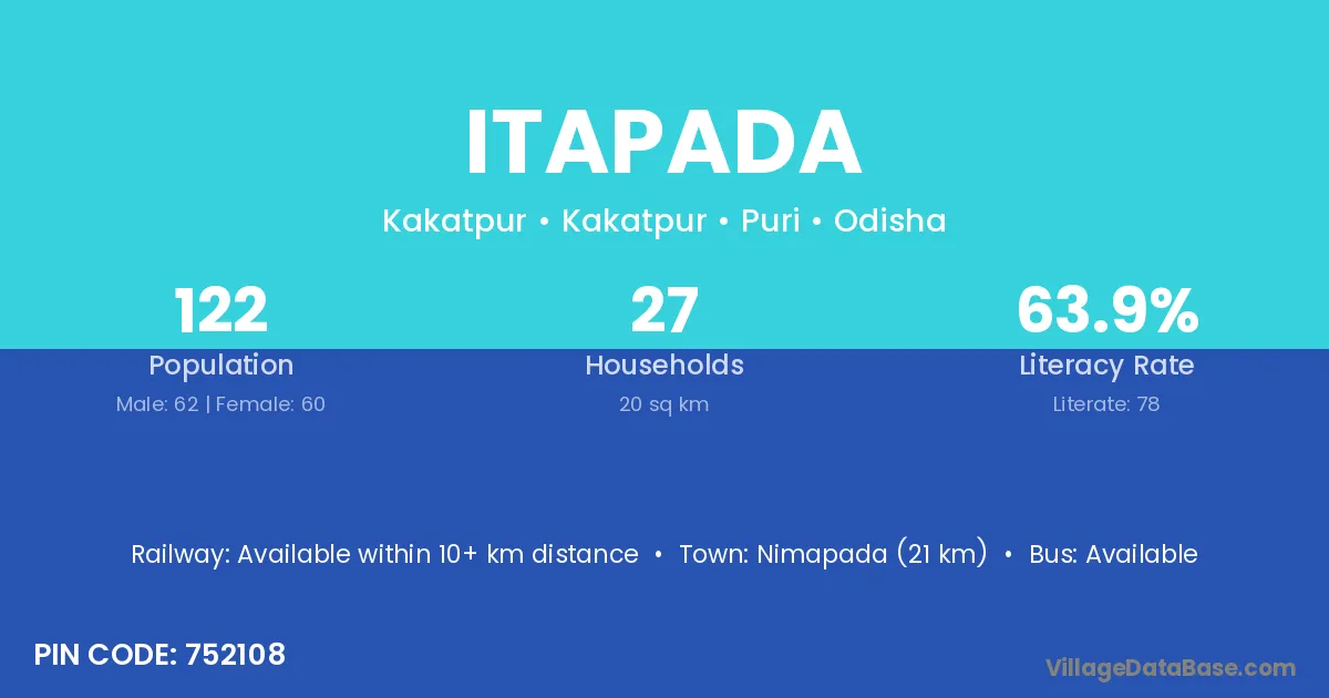 Jajapur (40 km) is the nearest town to Itapada village for major economic activities and is located approximately 40 km away.