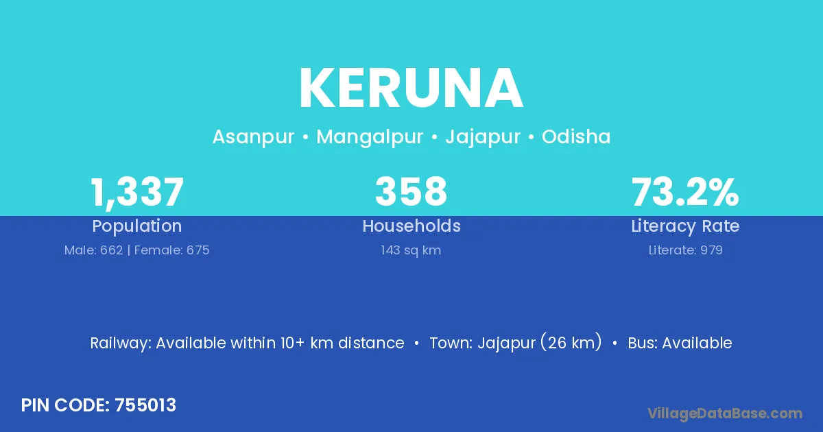 Jajapur (26 km) is the nearest town to Keruna village for major economic activities and is located approximately 26 km away.