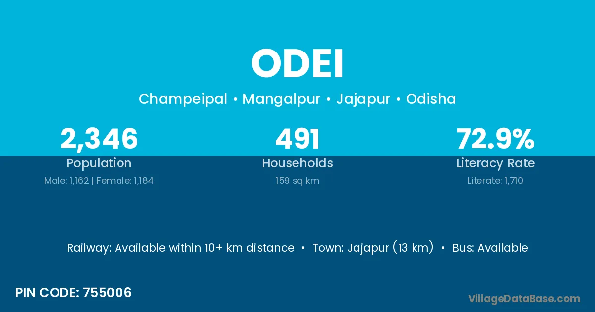 Jajapur (13 km) is the nearest town to Odei village for major economic activities and is located approximately 13 km away.