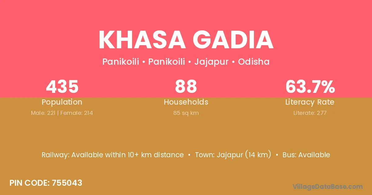 Jajapur (14 km) is the nearest town to Khasa Gadia village for major economic activities and is located approximately 14 km away.
