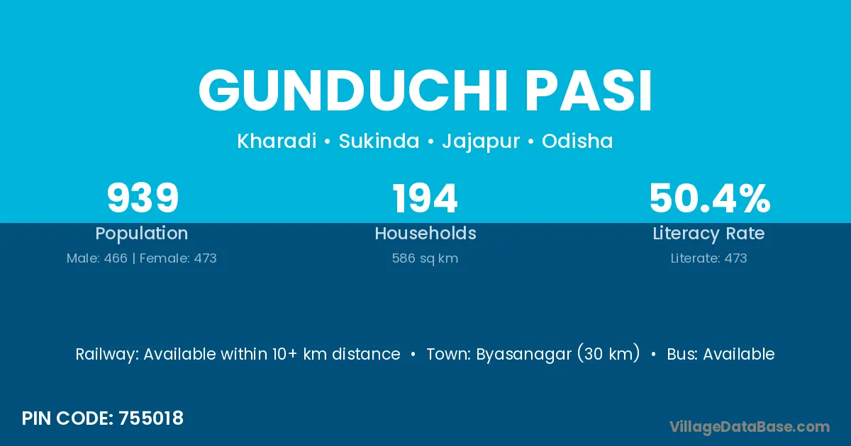 Byasanagar (30 km) is the nearest town to Gunduchi Pasi village for major economic activities and is located approximately 30 km away.