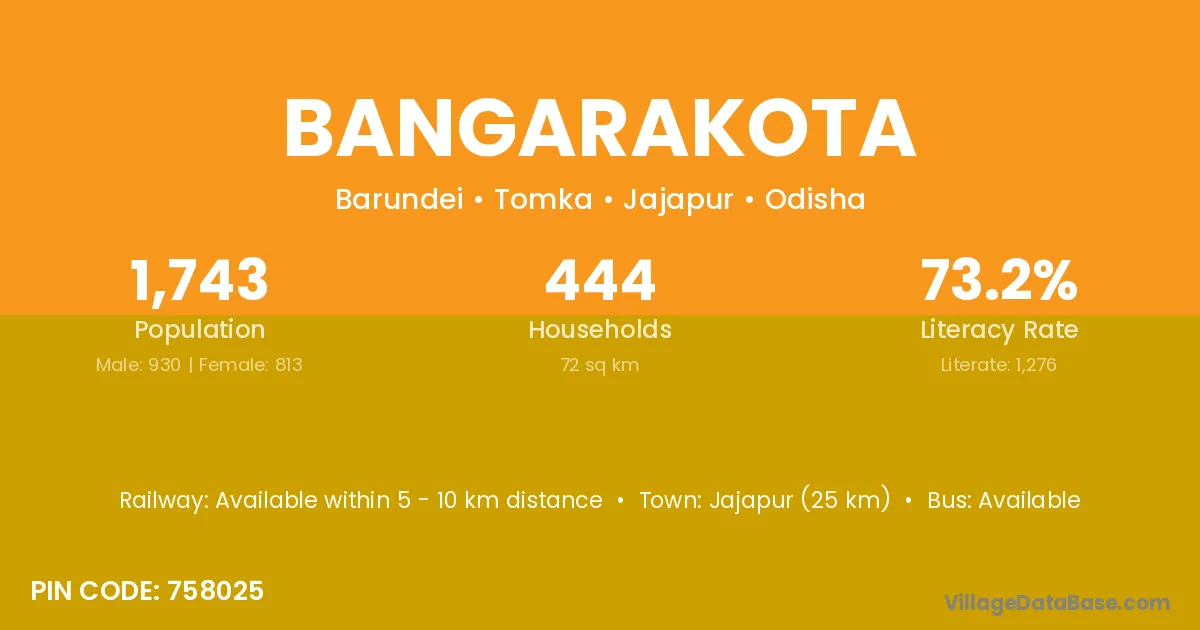 Jajapur (25 km) is the nearest town to Bangarakota village for major economic activities and is located approximately 25 km away.