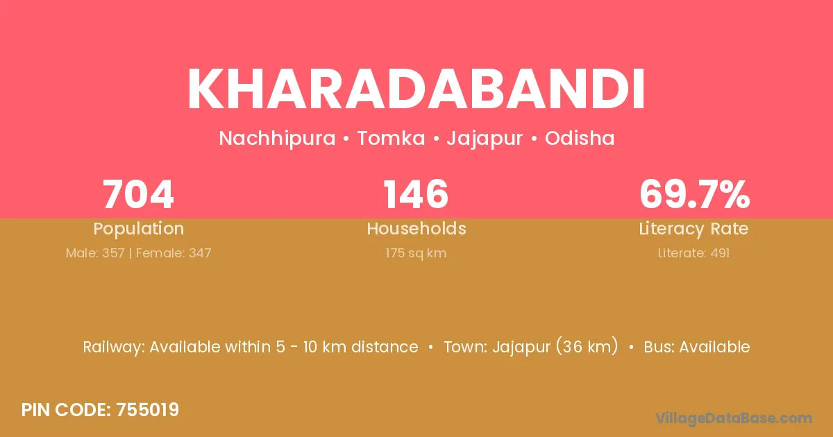 Jajapur (36 km) is the nearest town to Kharadabandi village for major economic activities and is located approximately 36 km away.