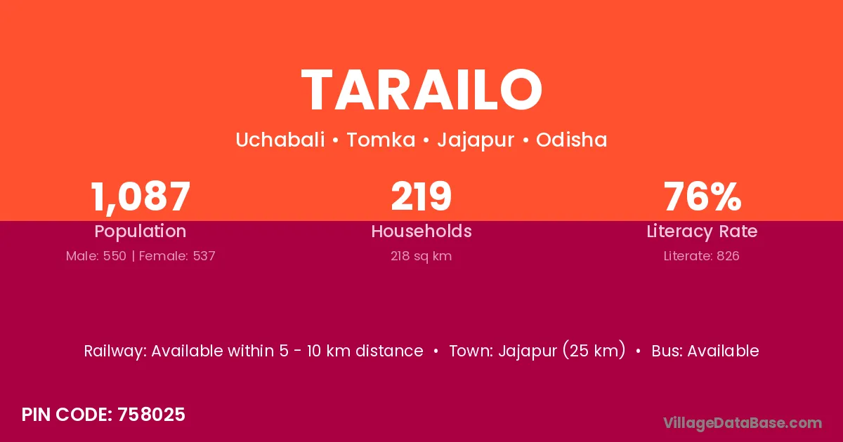 Jajapur (25 km) is the nearest town to Tarailo village for major economic activities and is located approximately 25 km away.