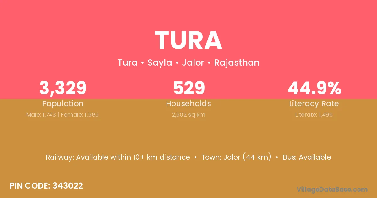 The literacy rate of Tura village is 83.46%. Male literacy stands at 90.70% and female literacy at 76.64%.