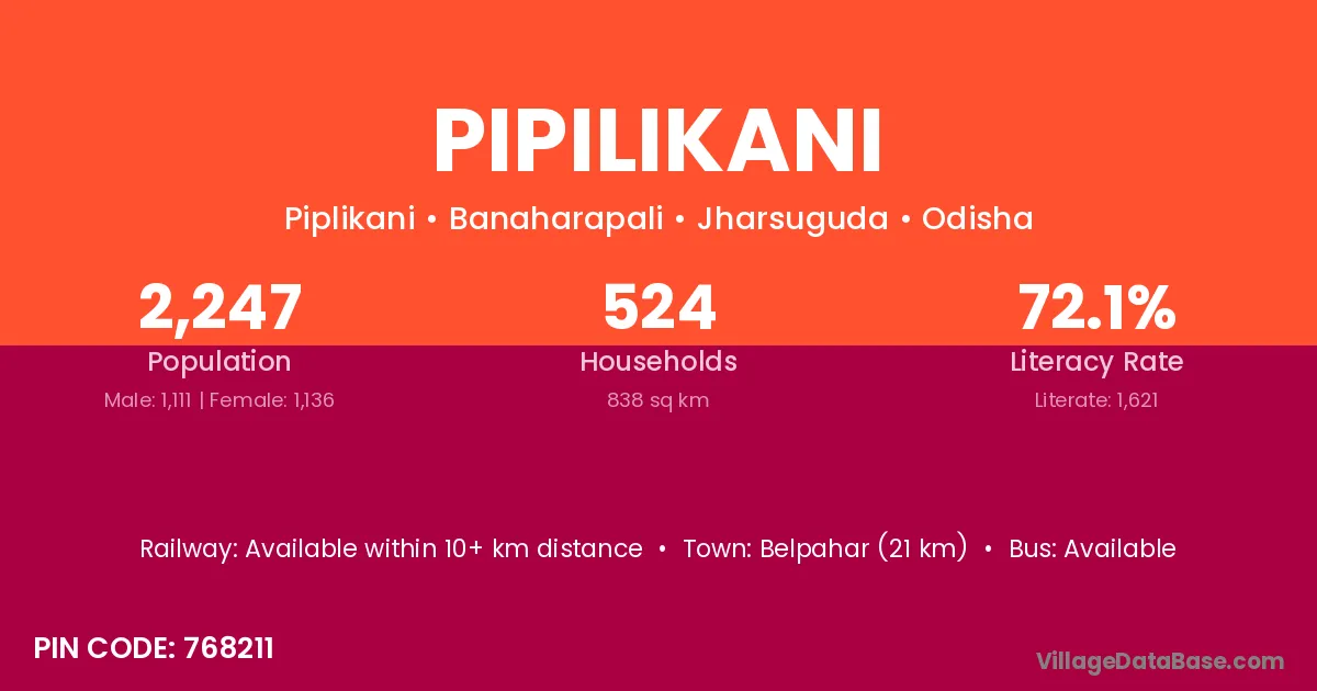 Belpahar (21 km) is the nearest town to Pipilikani village for major economic activities and is located approximately 21 km away.