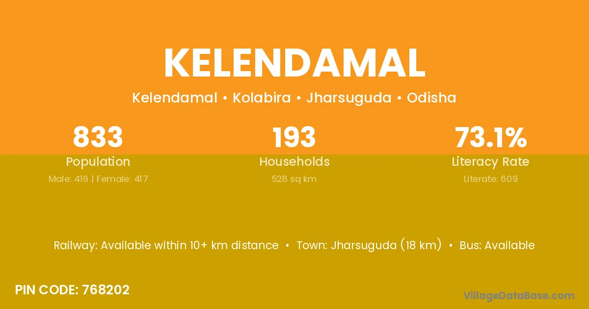 Jharsuguda (18 km) is the nearest town to Kelendamal village for major economic activities and is located approximately 18 km away.