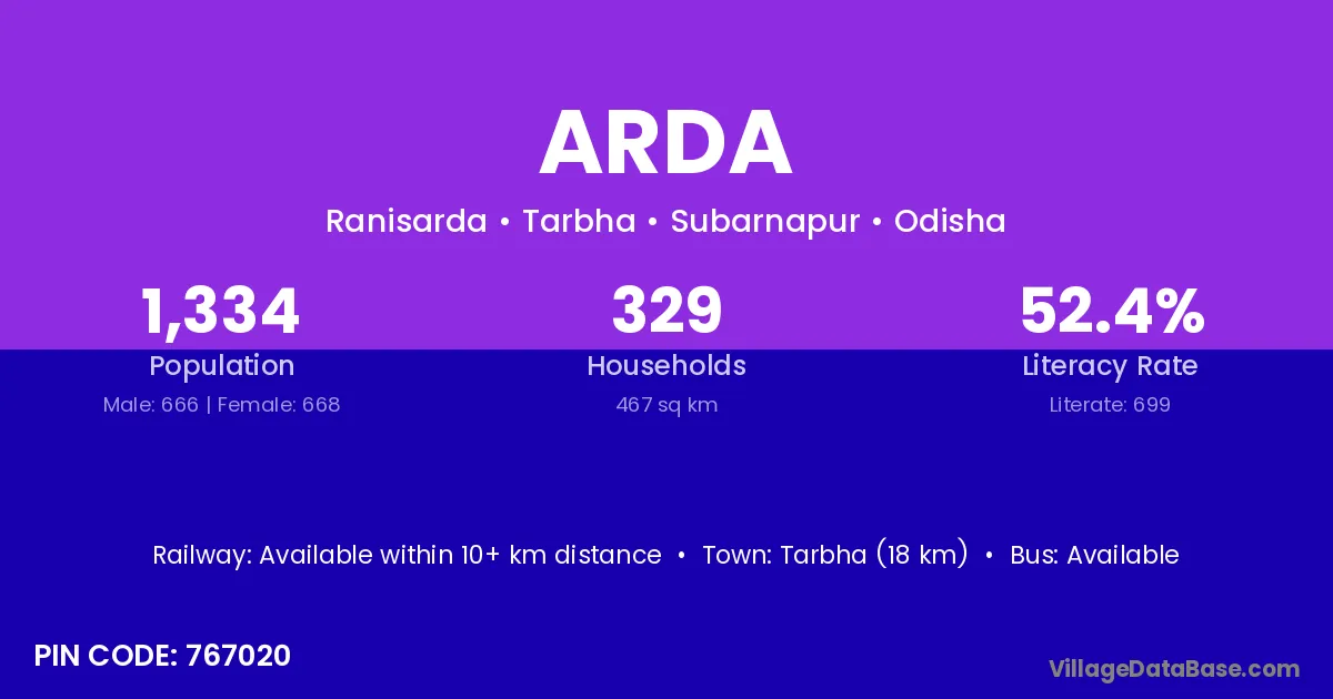 Jharsuguda (12 km) is the nearest town to Arda village for major economic activities and is located approximately 12 km away.