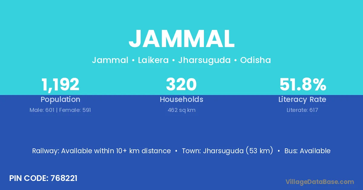 Jharsuguda (53 km) is the nearest town to Jammal village for major economic activities and is located approximately 53 km away.