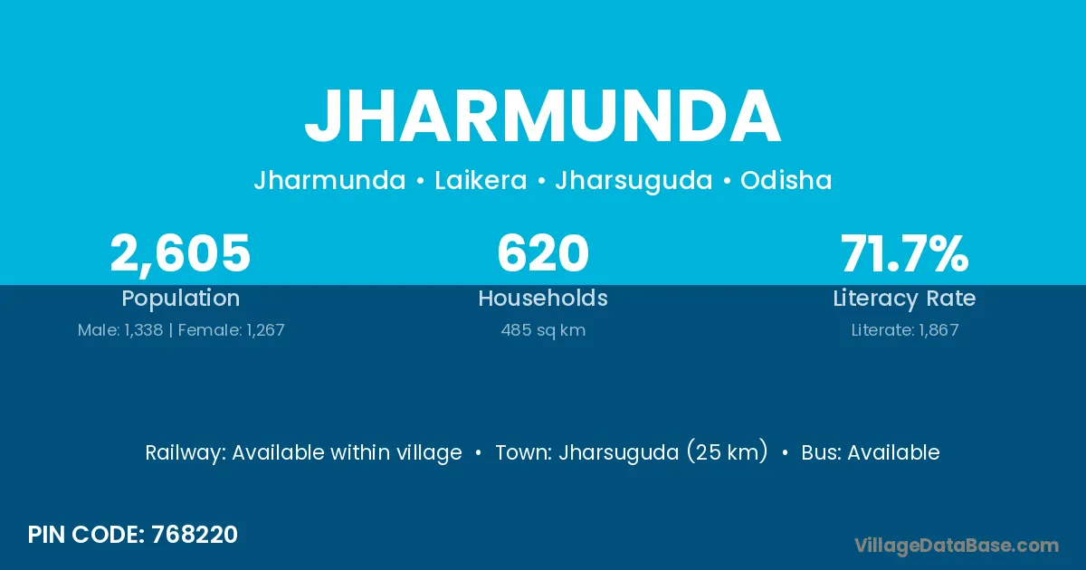 Jharmunda village has a total population of 2,605 people, of which 1,338 are males and 1,267 are females.