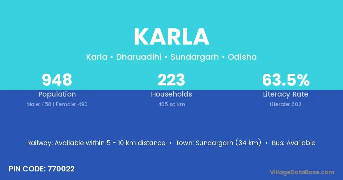 Jharsuguda (52 km) is the nearest town to Karla village for major economic activities and is located approximately 52 km away.