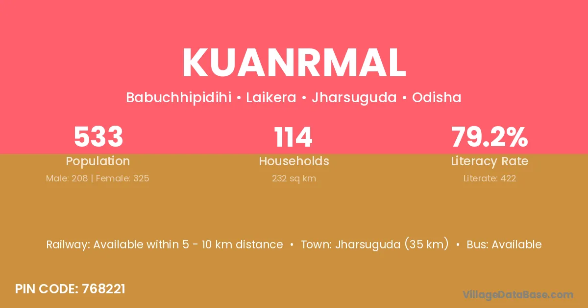 Jharsuguda (35 km) is the nearest town to Kuanrmal village for major economic activities and is located approximately 35 km away.