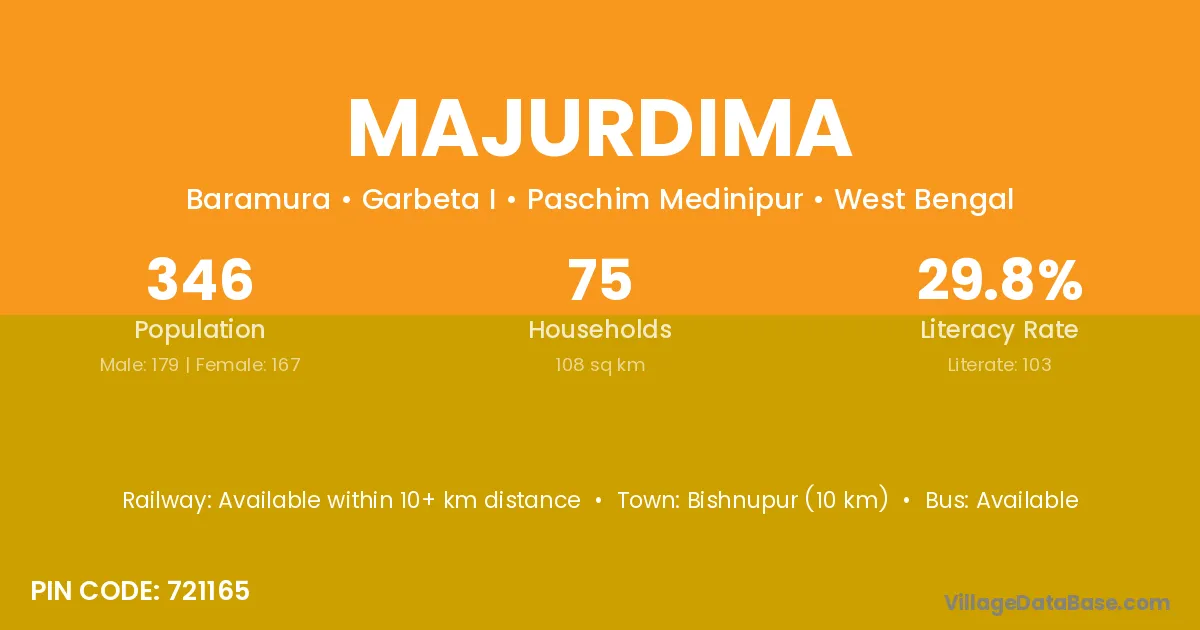 Jharsuguda (31 km) is the nearest town to Majurdima village for major economic activities and is located approximately 31 km away.