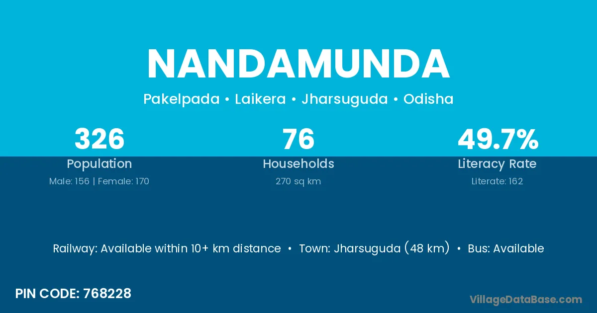 Jharsuguda (48 km) is the nearest town to Nandamunda village for major economic activities and is located approximately 48 km away.