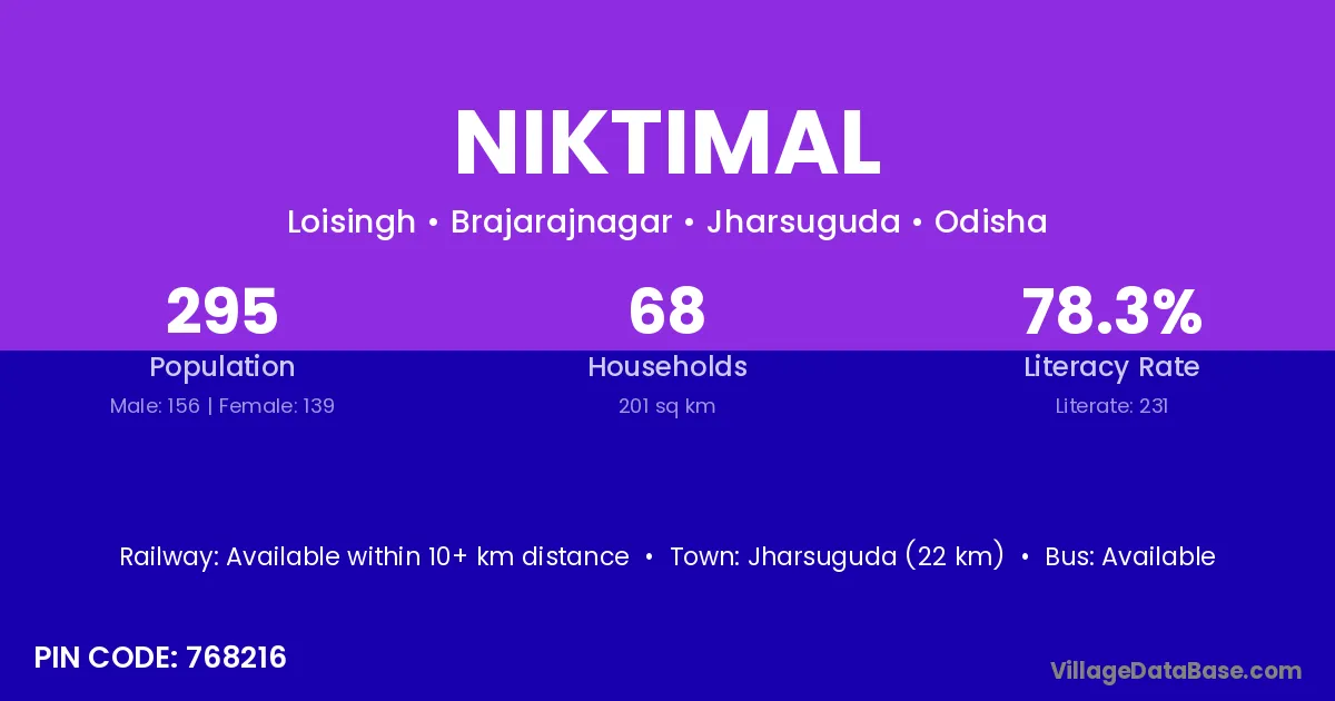 Jharsuguda (38 km) is the nearest town to Niktimal village for major economic activities and is located approximately 38 km away.