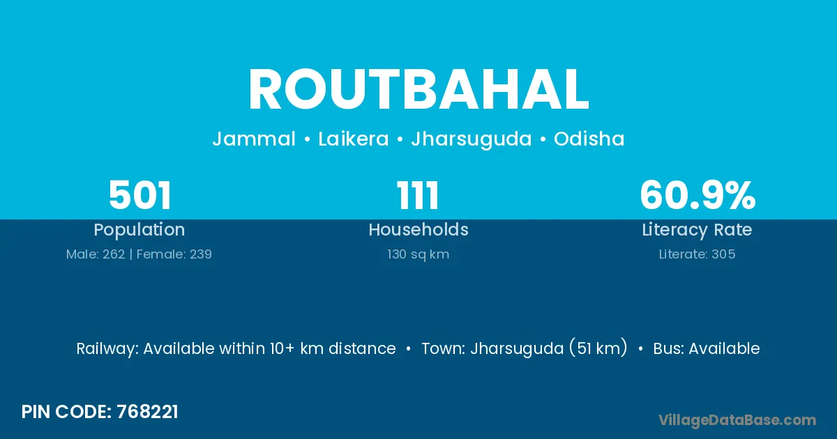 Jharsuguda (51 km) is the nearest town to Routbahal village for major economic activities and is located approximately 51 km away.
