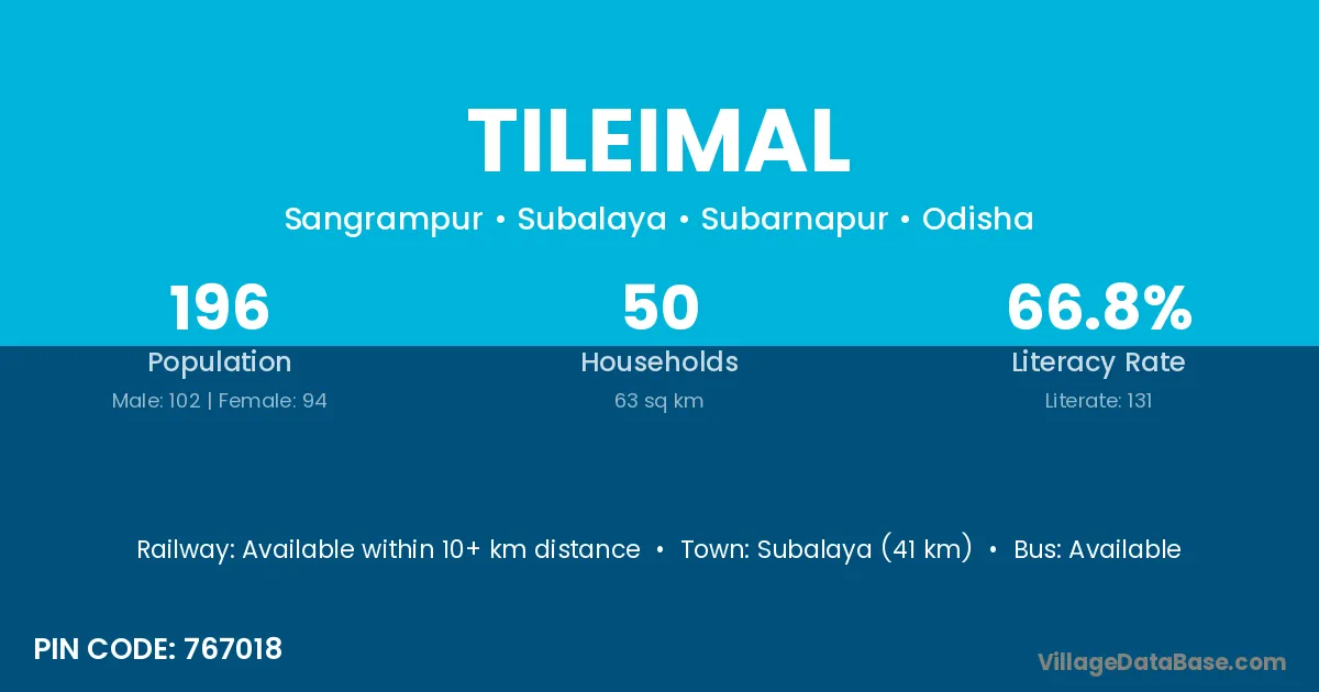 Jharsuguda (50 km) is the nearest town to Tileimal village for major economic activities and is located approximately 50 km away.