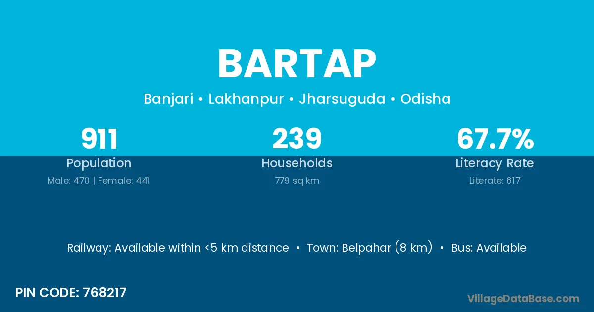 Belpahar (8 km) is the nearest town to Bartap village for major economic activities and is located approximately 8 km away.