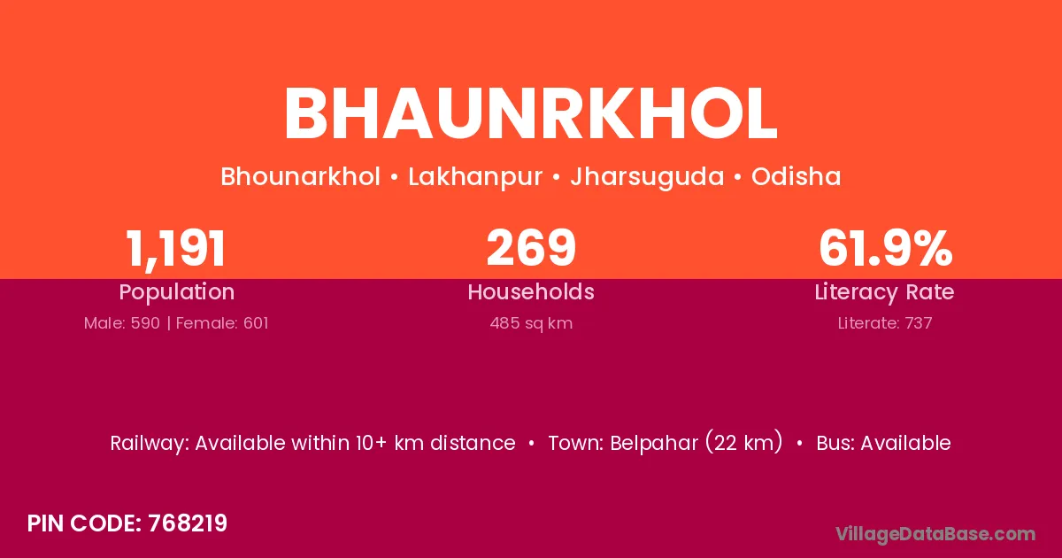 Belpahar (22 km) is the nearest town to Bhaunrkhol village for major economic activities and is located approximately 22 km away.