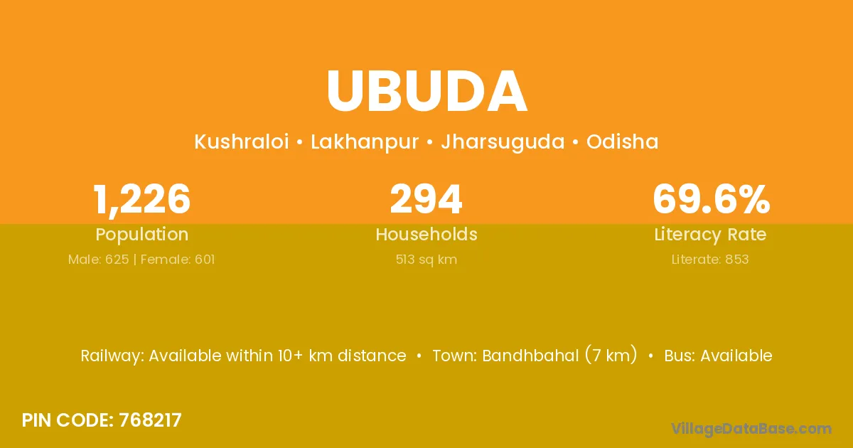 Bandhbahal (7 km) is the nearest town to Ubuda village for major economic activities and is located approximately 7 km away.