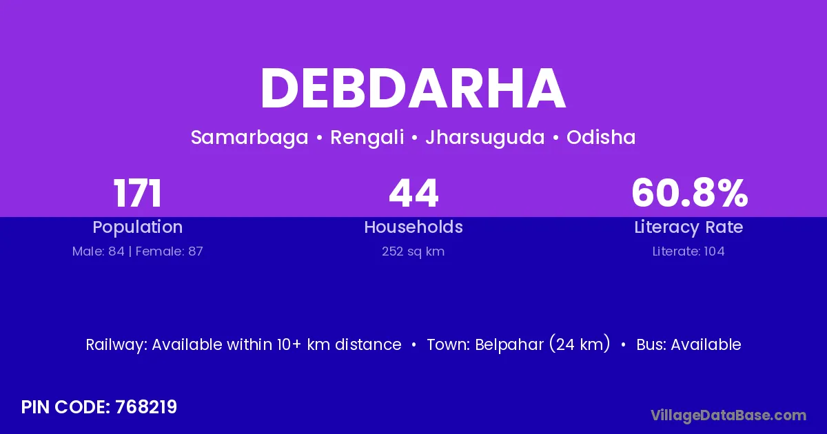 Debdarha village has a total population of 171 people, of which 84 are males and 87 are females.