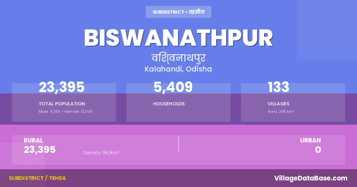 Biswanathpur is a town and Tehsil in the Kalahandi district of the Odisha. In India, a Tehsil is a subdivision of a district responsible for the administration and revenue collection of a specific area within the district. Tehsils play a crucial role in the local governance structure, contributing significantly to the development and administration of their communities.
