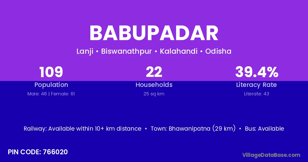 Bhawanipatna (29 km) is the nearest town to Babupadar village for major economic activities and is located approximately 29 km away.