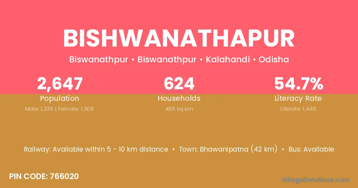 Bhawanipatna (42 km) is the nearest town to Bishwanathapur village for major economic activities and is located approximately 42 km away.