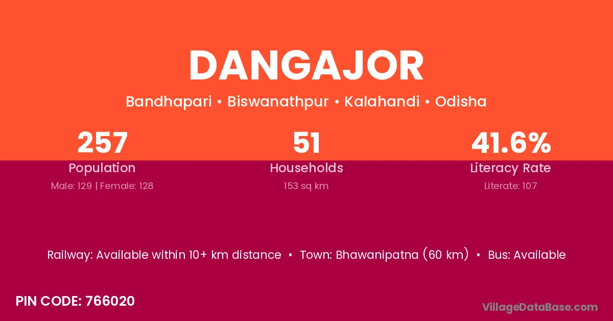 Bhawanipatna (60 km) is the nearest town to Dangajor village for major economic activities and is located approximately 60 km away.