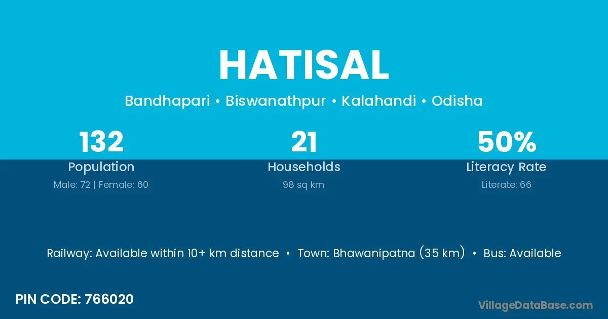 Bhawanipatna (35 km) is the nearest town to Hatisal village for major economic activities and is located approximately 35 km away.