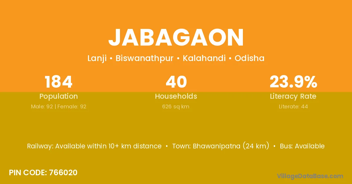 Bhawanipatna (24 km) is the nearest town to Jabagaon village for major economic activities and is located approximately 24 km away.