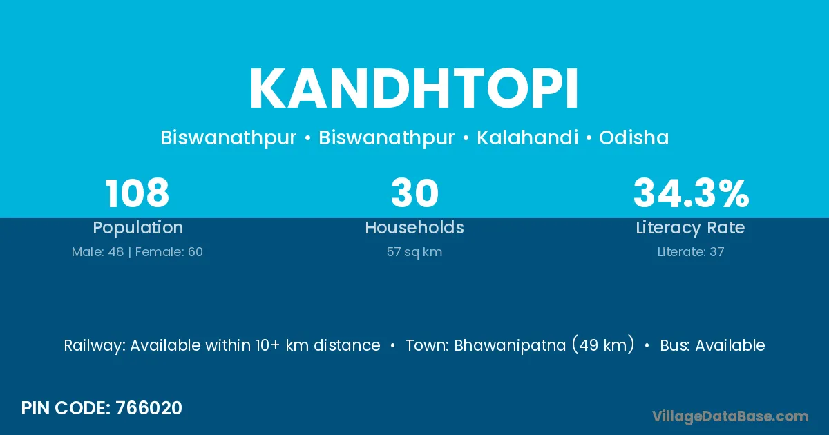 Bhawanipatna (49 km) is the nearest town to Kandhtopi village for major economic activities and is located approximately 49 km away.