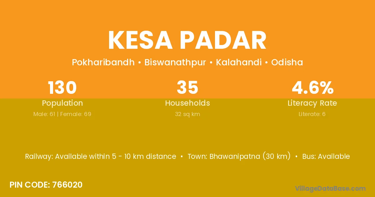 Bhawanipatna (30 km) is the nearest town to Kesa Padar village for major economic activities and is located approximately 30 km away.