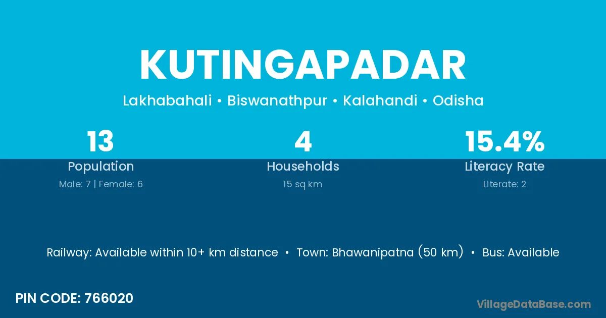 Bhawanipatna (50 km) is the nearest town to Kutingapadar village for major economic activities and is located approximately 50 km away.