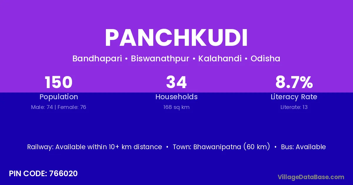 Bhawanipatna (60 km) is the nearest town to Panchkudi village for major economic activities and is located approximately 60 km away.