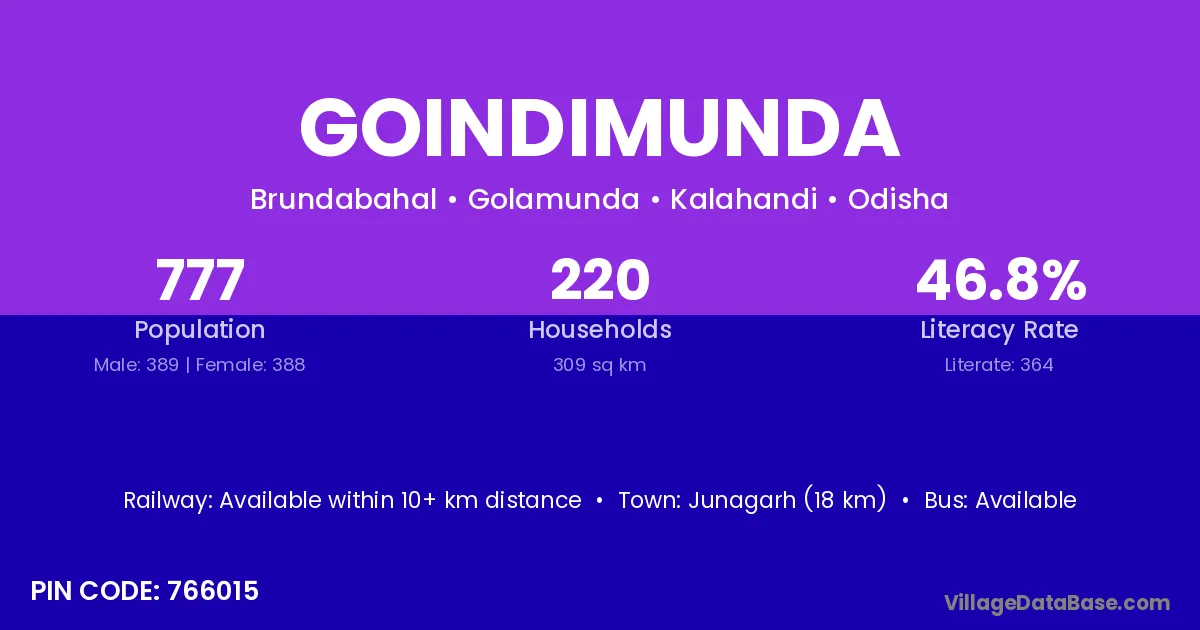 Goindimunda village has a total population of 777 people, of which 389 are males and 388 are females.