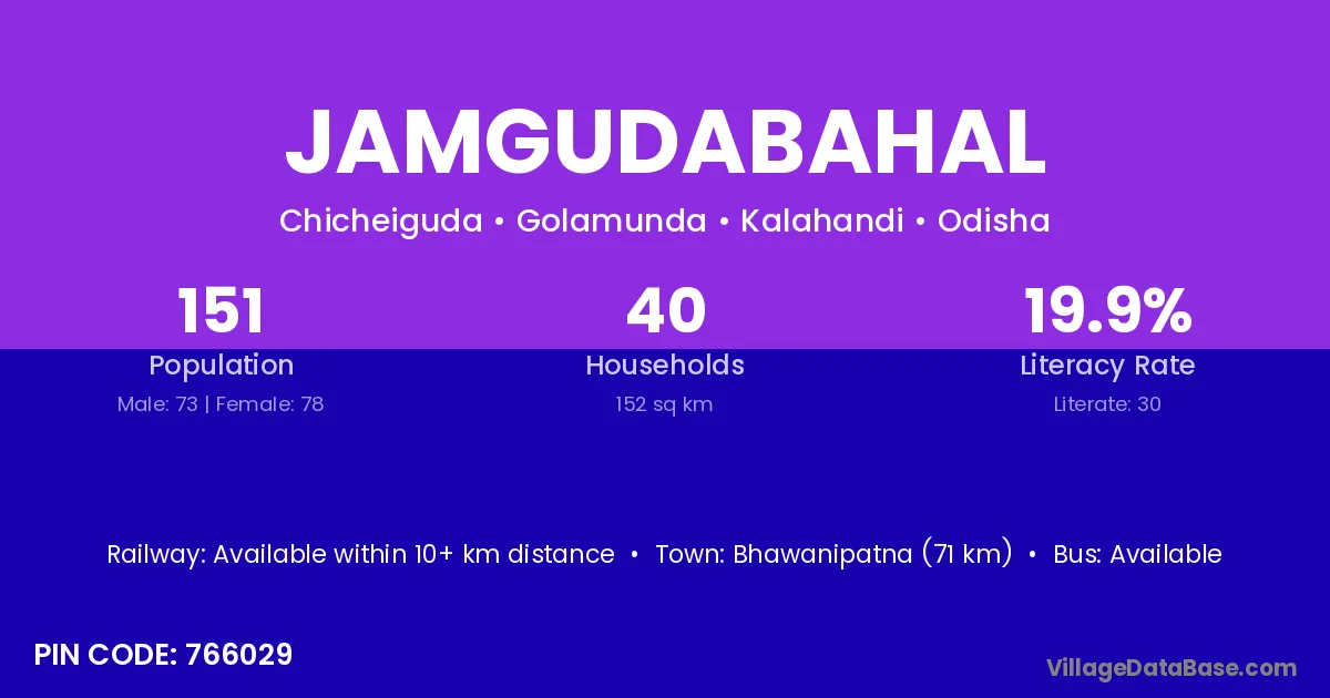 Bhawanipatna (71 km) is the nearest town to Jamgudabahal village for major economic activities and is located approximately 71 km away.