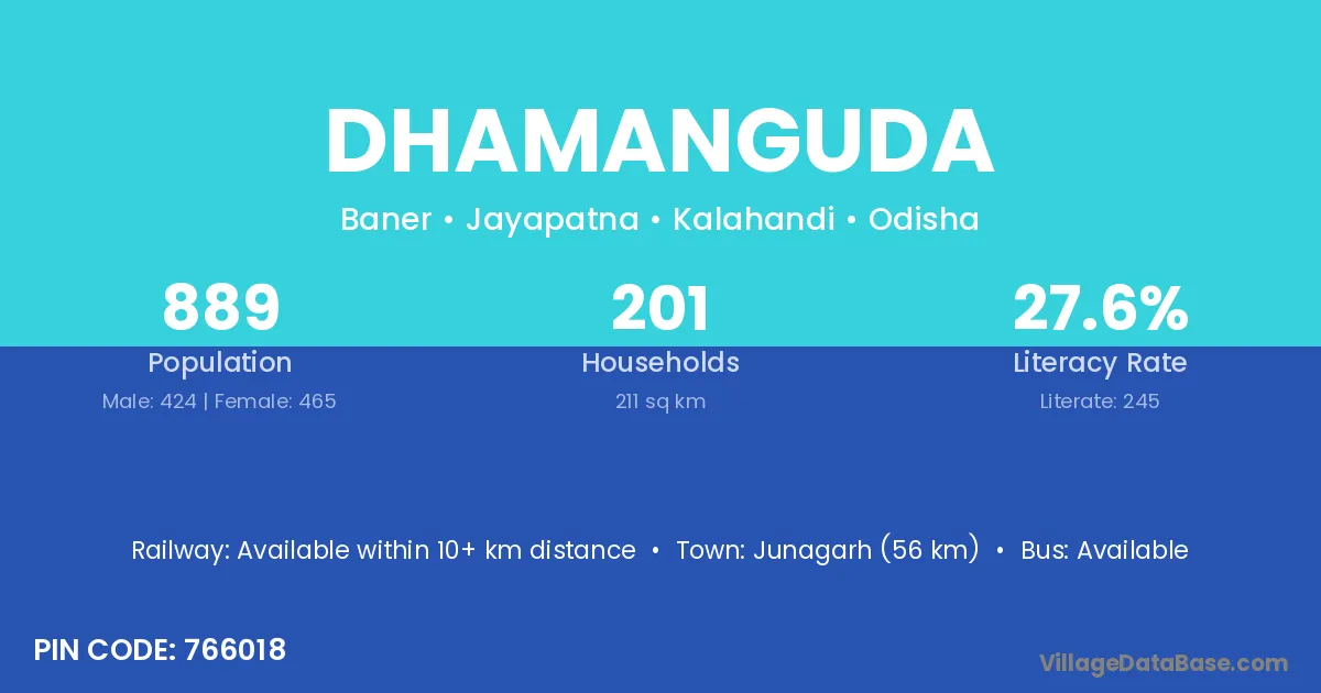 Junagarh (56 km) is the nearest town to Dhamanguda village for major economic activities and is located approximately 56 km away.