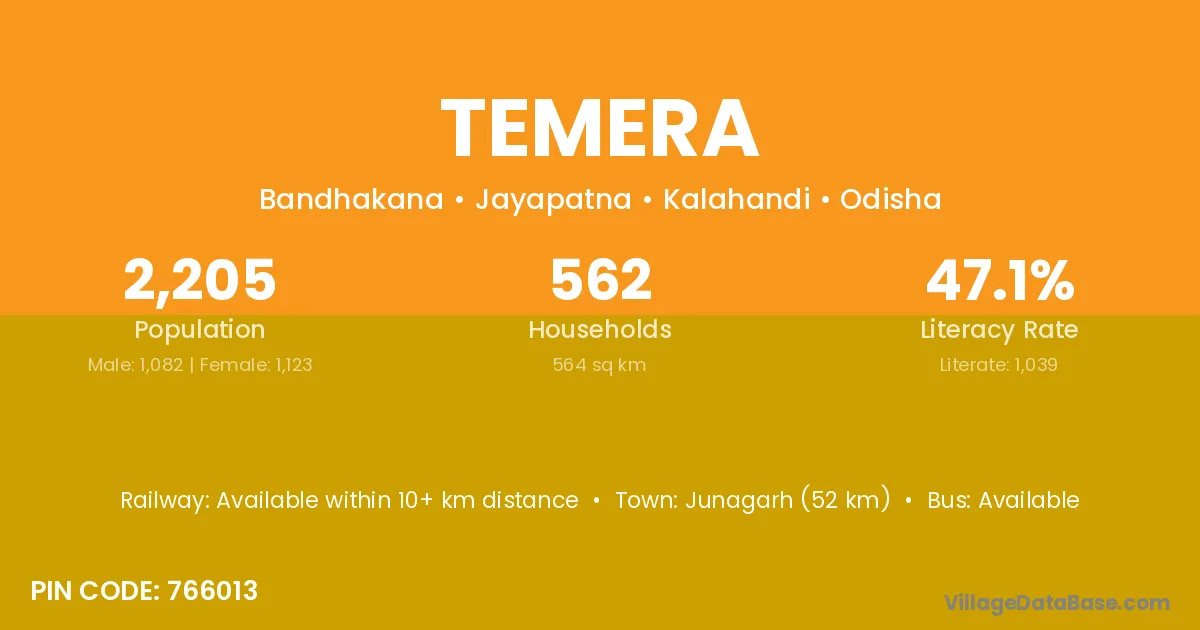 Junagarh (52 km) is the nearest town to Temera village for major economic activities and is located approximately 52 km away.