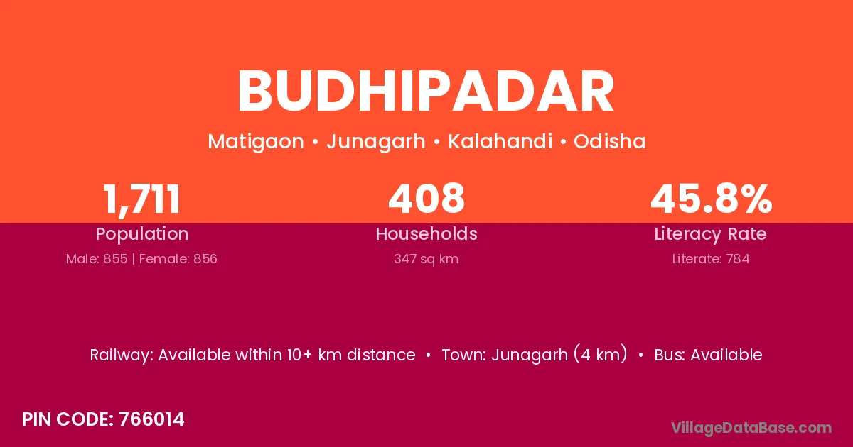 Junagarh (4 km) is the nearest town to Budhipadar village for major economic activities and is located approximately 4 km away.