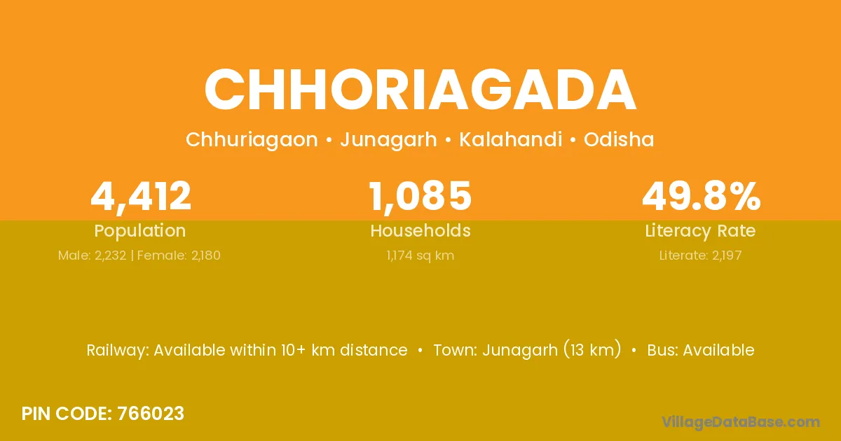 Junagarh (13 km) is the nearest town to Chhoriagada village for major economic activities and is located approximately 13 km away.