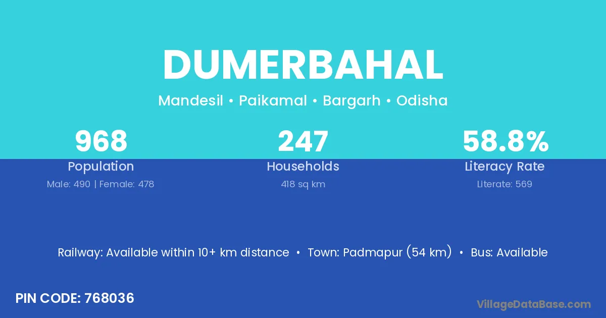 Dumerbahal village has a total population of 949 people, of which 467 are males and 482 are females.