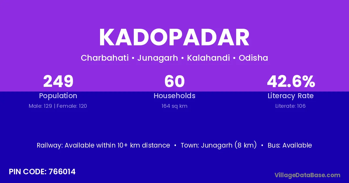 Kadopadar village has a total population of 249 people, of which 129 are males and 120 are females.
