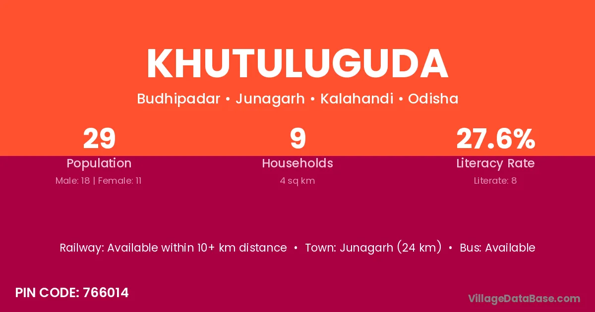 Junagarh (24 km) is the nearest town to Khutuluguda village for major economic activities and is located approximately 24 km away.