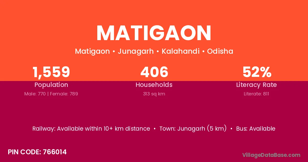 Junagarh (5 km) is the nearest town to Matigaon village for major economic activities and is located approximately 5 km away.
