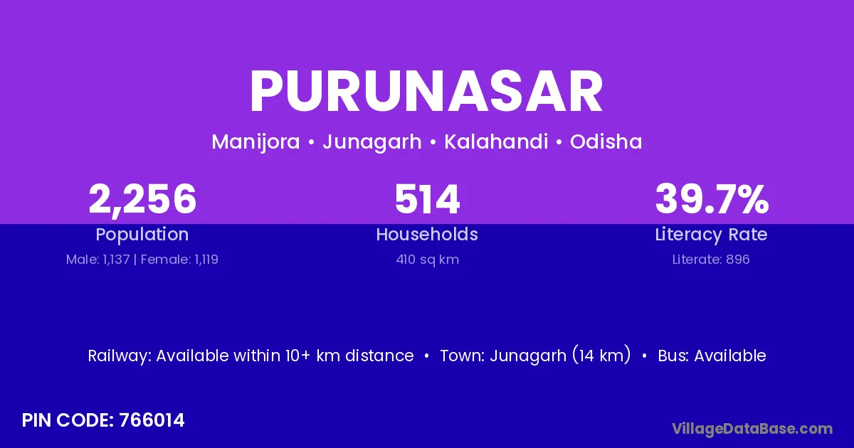 Junagarh (14 km) is the nearest town to Purunasar village for major economic activities and is located approximately 14 km away.