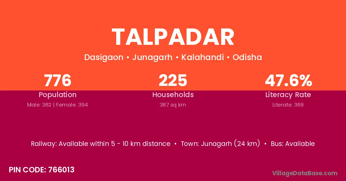 Junagarh (24 km) is the nearest town to Talpadar village for major economic activities and is located approximately 24 km away.